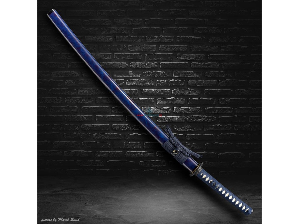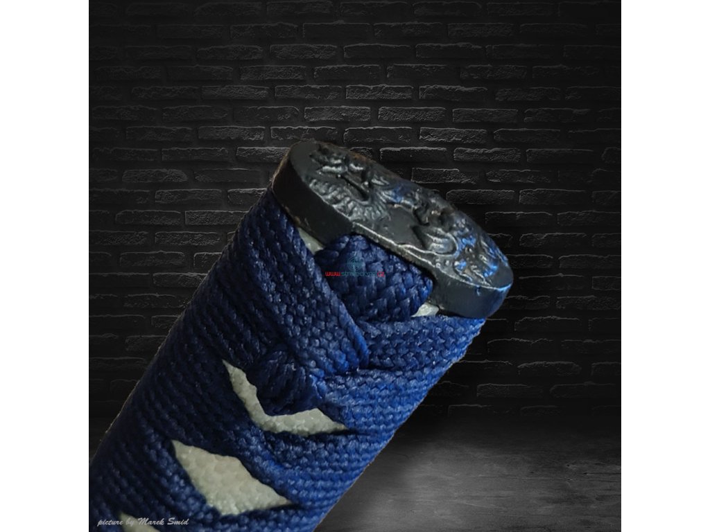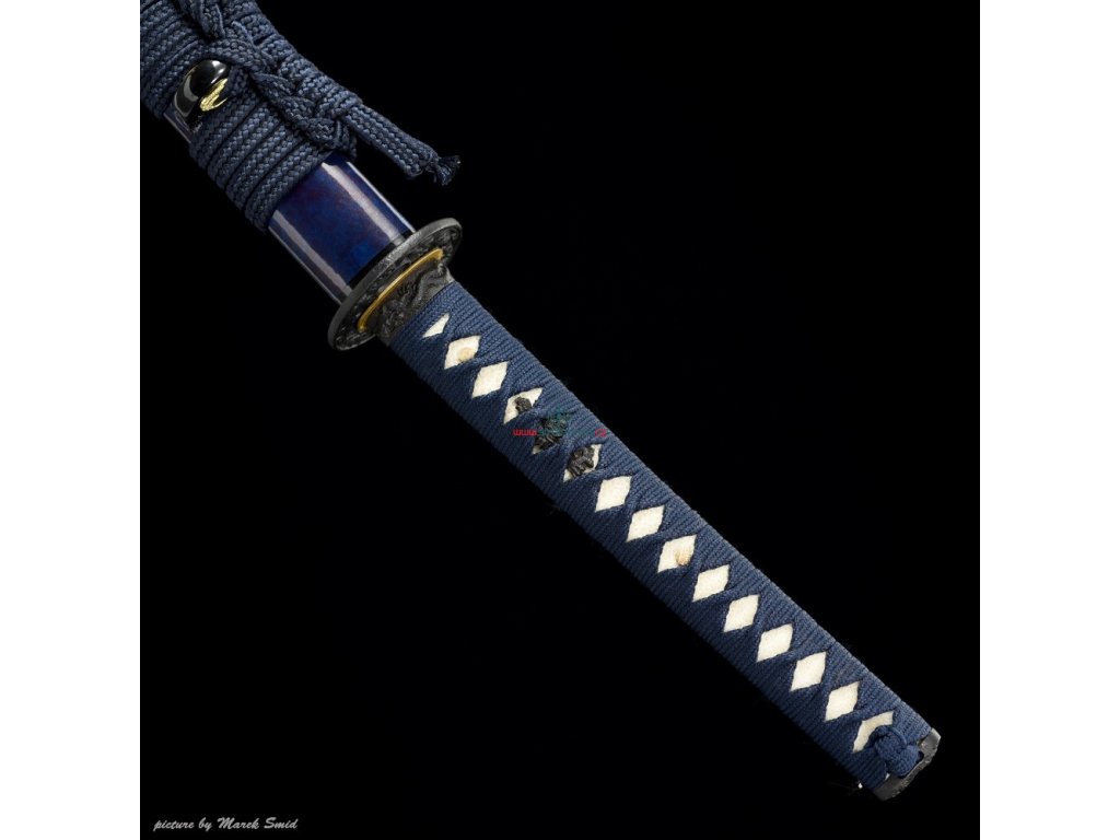 Tsuka (rukojeť): dřevěné jádro, potažena pravou rejnočí kůží (Samegawa), s modrou hedvábnou omotávkou ITO. Čepel zajištěna 2 bambusovými kolíky "mekugi"