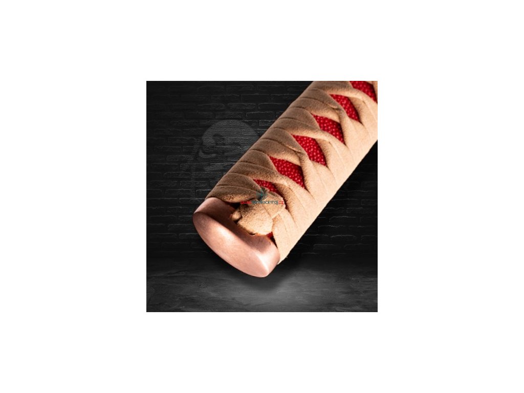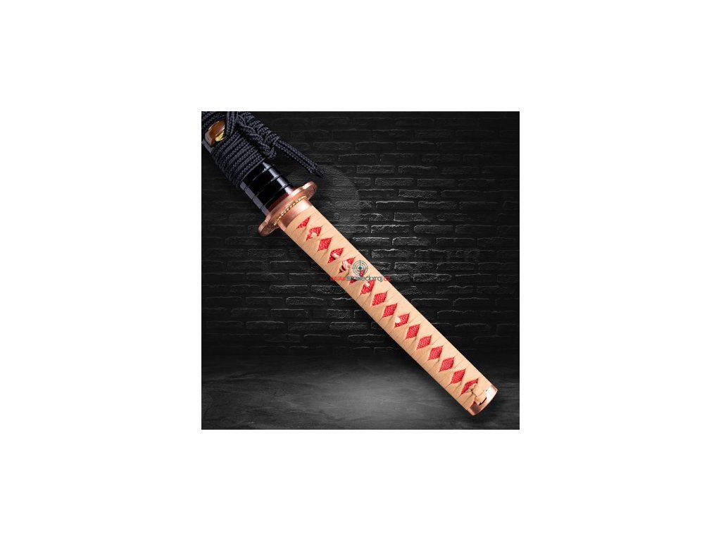 • Tsuka (rukojeť) - dřevěné jádro, potažena pravou rejnočí kůží (Samegawa), kožená semišová omotávka ITO. Čepel zajištěna 2 bambusovými kolíky "mekugi".