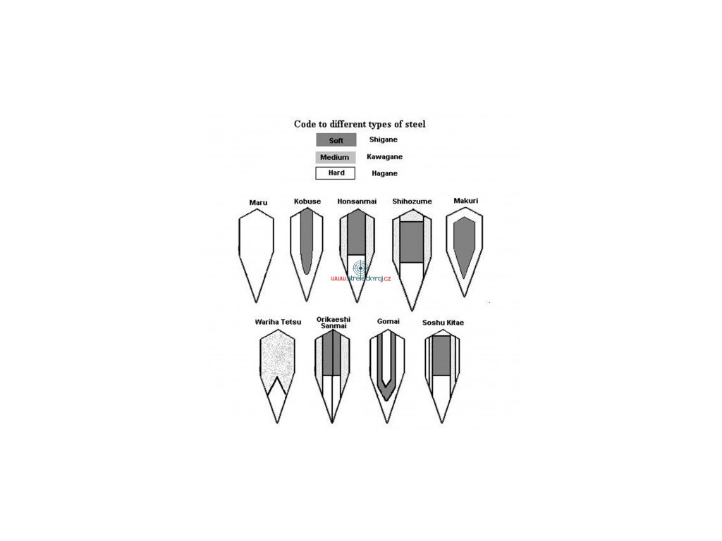 Ručně kovaná čepel z jádrem z oceli T-10 té nejvyšší kvality. Ocel byla laminována v konfiguraci HONSANMAI - diferenciálně tvrzená. Uhlíková ocel T-10 (obsah 1,1% uhlíku a 0,4% manganu) je velmi pevná a skvěle drží ostrost. Čepel bez žlábku bo-hi byla ve finální fázi ručně leštěna kamenem hazuya - tím je dosaženo téměř žiletkového ostří (razor sharp) a zrcadlového lesku.