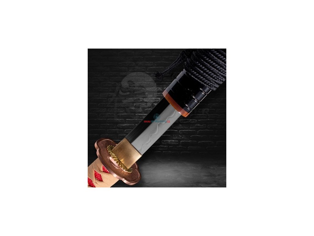 Výrazný reálný a nevšední hamon CHOJI je tvořen dle dávných tradičních metod, které vychází z mnohaletých zkušeností kovářského mistra, který výrobou této nádherné zbraně strávil několik dnů. Vše na tomto meči je individuálně zhotoveno, včetně saye a habaki, jsou použity nejkvalitnější komponenty, včetně špičkového laku na sayu, japonského hedvábí a skutečné rejnočí kůže nejvyšší kvality. Jedná se o špičkovou repliku samurajského meče, která je vhodná k sekovým zkouškám a lze ji rozložit na jednotlivé části. Tato čepel byla vyzkoušena a testována tak, aby odstranila vše co jí stojí v cestě ! Sori (zakřivení čepele) je speciálně navrženo tak, aby bylo dosaženo co možná nejjemnějších a nejčistších řezů. To vše v kombinaci s výběrem tradičního kovaného Koshirae zaručuje, že získáte to nejlepší z hlediska vzhledu i funkčnosti. Uhlíková ocel T-10 má působivou tvrdost HRC 58 - perfektní kombinace této tvrdosti je podtrženo zakřivením čepele Sori, které umožňuje snadné přeseknutí tatami, slaměné rohože, nebo bambusu pro tameshigiri. Full tang konstrukce této katany výrazně zvyšuje sílu meče. Čepel je typu shinogi-zukuri, tento typ čepele se vyrábí od 10.století našeho letopočtu. Hrot meče ko kissaki se skutečným Diamond-Shaped Yokote, které je velmi dobře definováno tím, že hamon prochází po celé délce přes Boshi. Yokote je velmi důležité pro strukturální integritu špičky meče. Pomáhá absorbovat otřes, rozptýlí sílu a přispívá k stabilitě a síle meče při tzv. sekořezu. Tato katana (samurajský meč) je vhodná na použití v praxi, firma Dellinger se však zříká jakékoliv odpovědnosti za zranění a poškození vzniklá při použití. Schraňujte mimo dosah dětí ! Jakákoliv manipulace se samurajským mečem je na vaší vlastní odpovědnost. Nezapomeňte, že máte ve svých rukou smrtící zbraň !