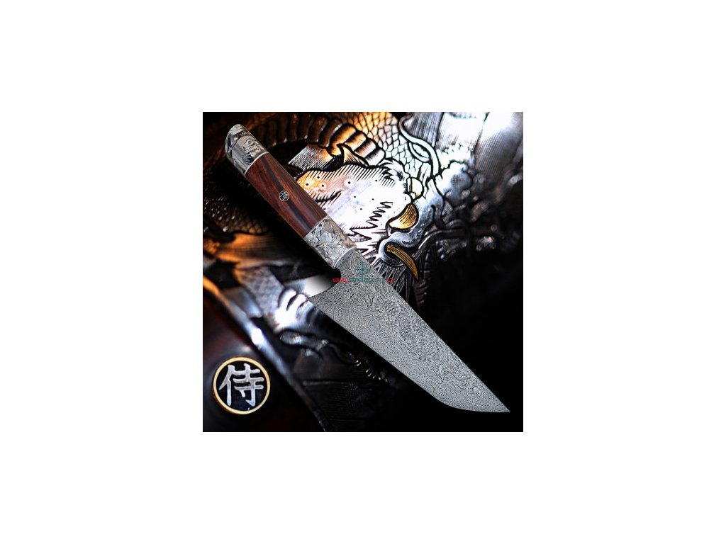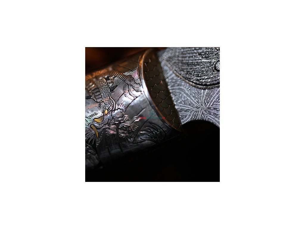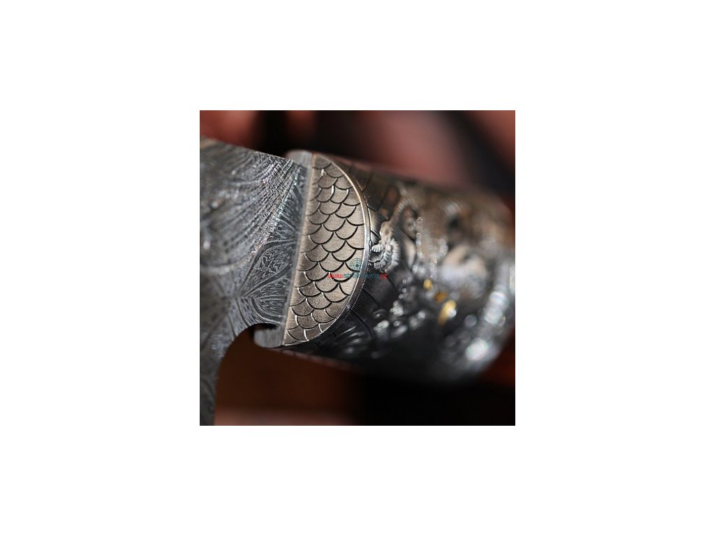 Jedinečný nůž "Dragon Sign Engraved" čepel ze švédské damaškové oceli SANDVIK 19C27 + 440C + 1095 spider bombing mosaic pattern. Rukojeť je složena z ručně ryté nerezové oceli a ze dřeva Desert Iron Wood. Nepřehlédnutelný vzor damaškové oceli a ručně ryté oboustranné "HORIMONO" tvoří perfektní pár a konečný výsledek je naprosto uchvacující. Každý nůž je ručně vyrobený a tím pádem jedinečný a originální. Vyrobeno bylo pouze 9 kusů a každý je dodáván s certifikátem pravosti.