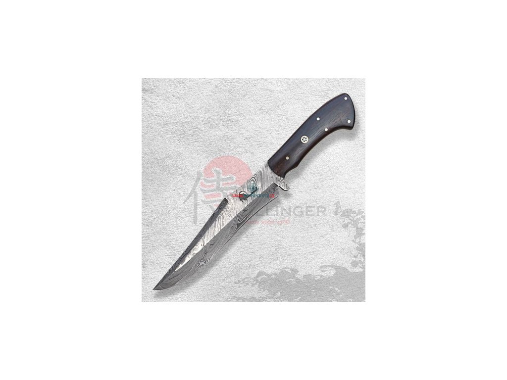 Nůž Dellinger Damask Cocoboloe velmi praktický lovecký nůž. Čepel tohoto pevného nože je vyrobena z damaškové uhlíkové oceli, kdy vyšší obsah uhlíku přispívá k její větší tvrdosti a odolnosti materiálu, snáze se brousí. Nůž není nerezový. Díky tomu je potřeba o čepel také více pečovat - pravidelná údržba, včetně vytření do sucha po použití a následném naolejování - tím minimalizujete riziko koroze. Rukojeť je vyrobená ze dřeva Cocobolo. To je druh palisandru rostoucího v tropickém podnebí. Je to dřevo červeno-hnědé barvy s černým rýhováním. Je to tvrdé dřevo, rukojeti toho hodně vydrží a ještě vypadají krásně. Nůž je dodávaný s koženým pouzdrem.
