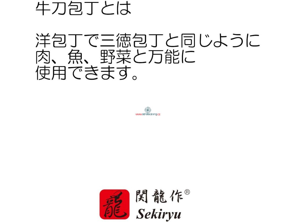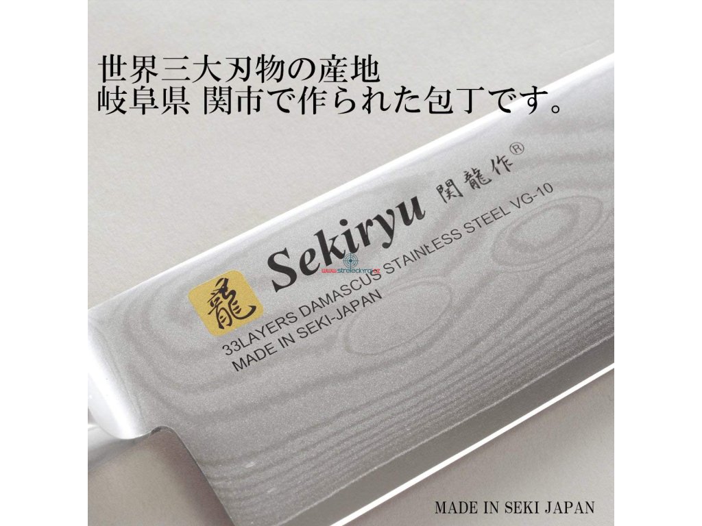 Nůž GYUTO / Chef 240 mm Sekiryu od japonské společnosti má ultra ostré řezné jádro z japonské oceli vg10, které je velmi dobře chráněno proti korozi. Japonská ocel vg10 má dlouhotrvající ostrost při tvrdosti R62 +/- 1 Rockwella. Jádro z japonské oceli vg10 je vloženo mezi 66 vrstev 2 nerezových damascénských ocelí (damascus steel), které zajišťují mimořádnou odolnost a houževnatost. Dokonale vyvážená a široká čepel japonského tvaru s třpitivým damascénským vzorem minimalizuje tření při řezu a zabraňuje přilepení krájeného materiálu k čepeli. Damascénský vzor je jedinečný, neopakovatelný a stane se symbolem Vaší individuality.