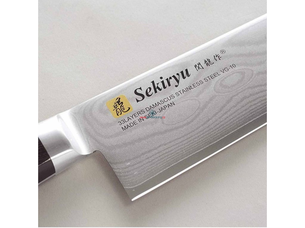 Nůž GYUTO / Chef 270 mm Sekiryu od japonské společnosti má ultra ostré řezné jádro z japonské oceli vg10, které je velmi dobře chráněno proti korozi. Japonská ocel vg10 má dlouhotrvající ostrost při tvrdosti R62 +/- 1 Rockwella. Jádro z japonské oceli vg10 je vloženo mezi 66 vrstev 2 nerezových damascénských ocelí (damascus steel), které zajišťují mimořádnou odolnost a houževnatost. Dokonale vyvážená a široká čepel japonského tvaru s třpitivým damascénským vzorem minimalizuje tření při řezu a zabraňuje přilepení krájeného materiálu k čepeli. Damascénský vzor je jedinečný, neopakovatelný a stane se symbolem Vaší individuality.