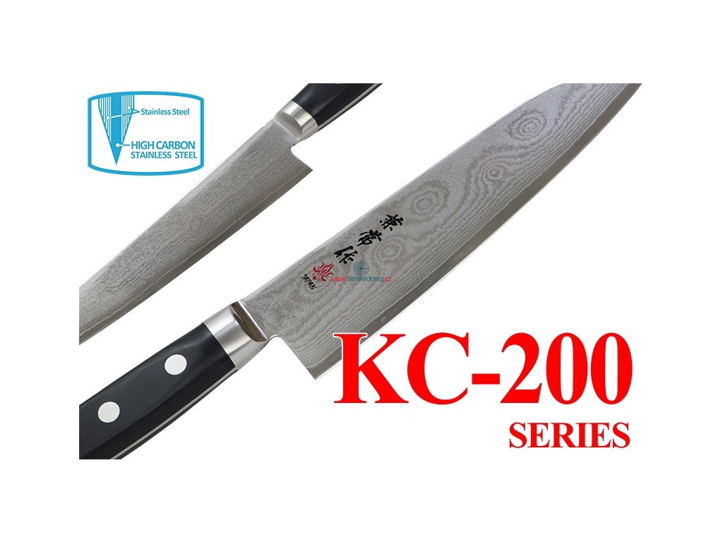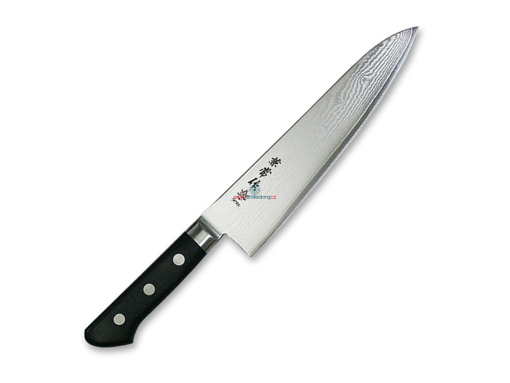 Velmi ostrý nůž Gyuto 210 mm Kanetsune KC-200 series Je vyroben z damascénské oceli ( damascus steel ) s jádrem z oceli VG-10 s působivým designem a nejvyšší kvalitou. Hřbet nože a ostří se zužují do špičky pro všestranné využití mimořádné řezné síly. Krájení, plátkování, čištění masa, ovoce a zeleniny – nic nebude pro tento jedinečný nůž japonského tvaru problémem. Kuchařský nůž GYUTO je díky výše položenému hrotu, též vhodný ke kolébkovému krájení bylinek, zeleniny a ořechů. Dlouhá čepel a klasická rukojeť Vám poskytne tu nejlepší kontrolu při řezání a krájení. Japonské umění, preciznost a nové technologie činí tento nůž z damascénské oceli (damascus steel ) jedinečným a nenapodobitelným.