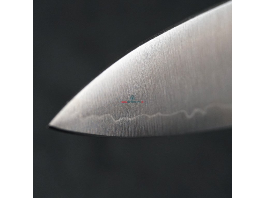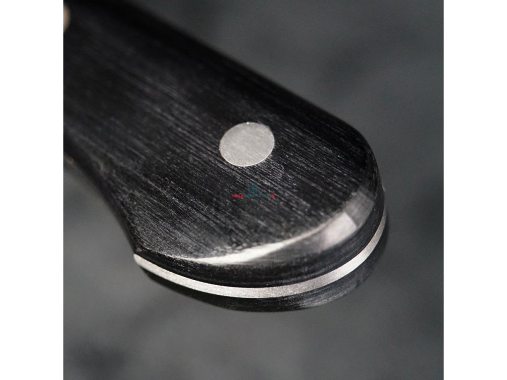 Rukojeť: západní rukojeť je vyrobena z PAKKA WOOD. Vždy je pečlivě ručně leštěná, ergonomicky tvarovaná a navržena pro vynikající ruční ovládání. Tento nůž je vhodný pro použití pravou i levou rukou. Mozaikový pin umístěný ve středu rukojeti působí japonským dojmem a je dokonalým designovým prvkem.