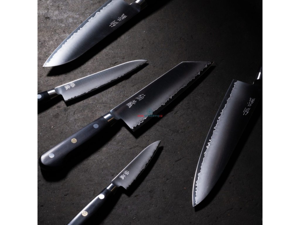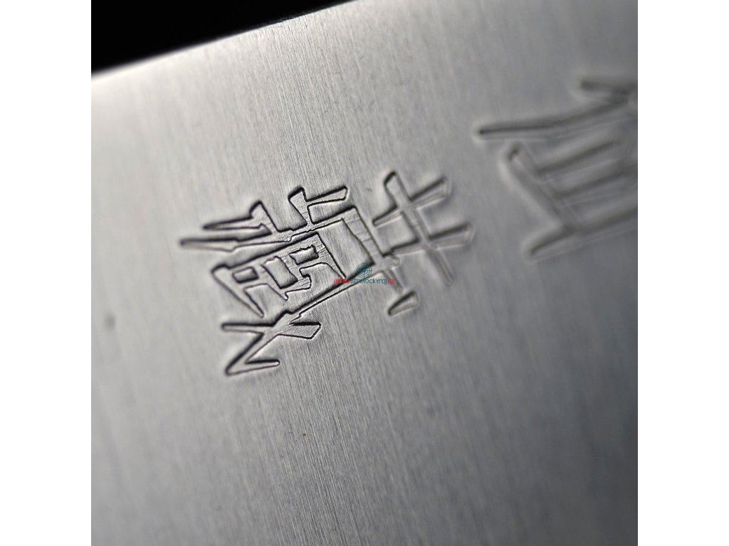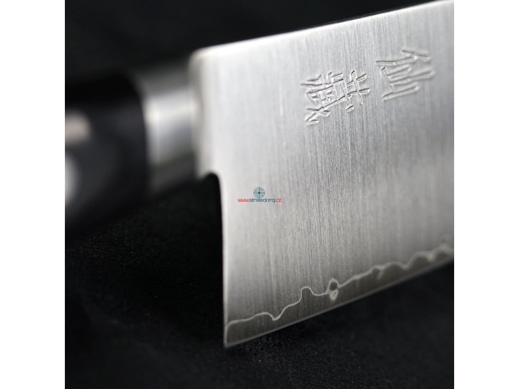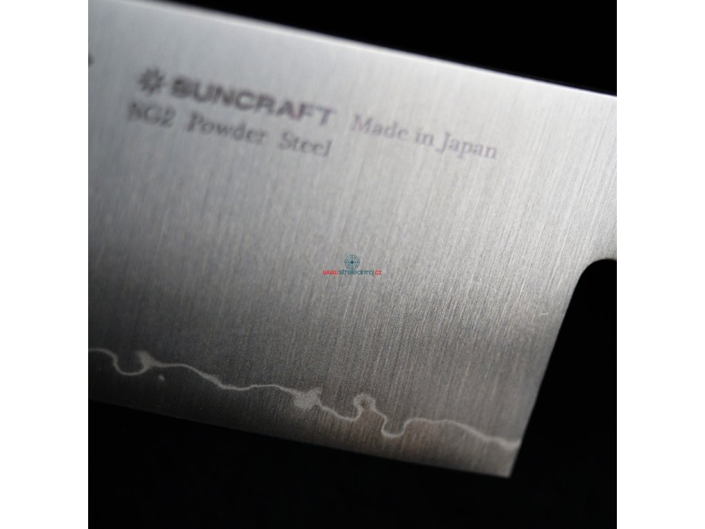 Materiál čepele: jádro nože je z oceli SG2 (super gold 2), známé také jako R2 nebo SRS-2, která byla vyvinuta v Japonsku. Tato ocel patří mezi tzv. práškové oceli, což znamená, že je vyrobena z jemně mletého prášku železa a uhlíku. SG2 je považována za jednu z nejlepších ocelí pro výrobu nožů na světě. Ocel SG2 je známá svou vynikající kombinací tvrdosti, odolnosti proti opotřebení a korozní odolnosti. Obsahuje přibližně 1,3 % uhlíku, což jí poskytuje vysokou tvrdost a zároveň zachovává dostatečnou pružnost. Ocel SG2 je legovaná přísadami jako chrom, molybden a vanad, které přispívají k jejímu vylepšenému výkonu. Nože vyrobené z oceli SG2 jsou obvykle ručně kované a mají vynikající ostří. Díky vysoké tvrdosti oceli je možné dosáhnout dlouhodobého udržení ostrosti, což je důležité pro každodenní používání nože. Tato ocel je také dobře odolná proti korozi, což znamená, že nože z SG2 jsou snadno udržovatelné a odolné vůči vlivům vlhkosti. Japonská ocel SG2 je oblíbená mezi profesionálními kuchaři. Její vysoká kvalita, výkon a estetická hodnota ji činí atraktivní volbou pro ty, kteří oceňují kvalitní nože. Nože vyrobené z oceli SG2 jsou obvykle dražší kvůli použití této vysoce kvalitní oceli a mnohdy ručnímu zpracování. Na obou stranách čepele je použita nerezová ocel odolná proti korozi. Výsledkem je krásný vlnovitý vzor (hamon) na ostří čepele, podobný jako u japonského samurajského meče.