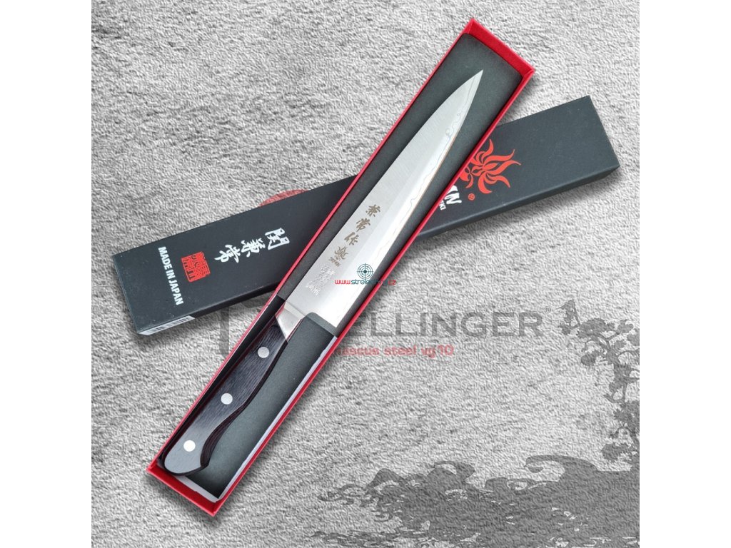 Překrásný všeobecně použitelný nůž ze série Kanetsune Hon-Warikomi YS-900 series. Jádro nože je z mimořádně tvrdé švédské oceli Sandvik 19C27, které je vložené mezi 2 vrstvy nerezové oceli SUS 410. Nůž Petty 150mm – je užitečnou alternativou velkého šéfkuchařského nože v okamžiku kdy potřebujete přesné řezy, nebo například krájení zelených fazolí nebo jiné menší zeleniny a ovoce. Jsou vhodné též pro špikování a krájení masa. Zaoblené ostří umožňuje mírné kývání při řezu. Jeho ostrost je ideální pro přípravu sendvičů všeho druhu. Úzká čepel a rukojeť z PLYWOODU s trojím nýtováním Vám poskytne tu nejlepší kontrolu při řezání a krájení. Japonské umění, preciznost a nové technologie činí tento nůž jedinečným a nenapodobitelným.