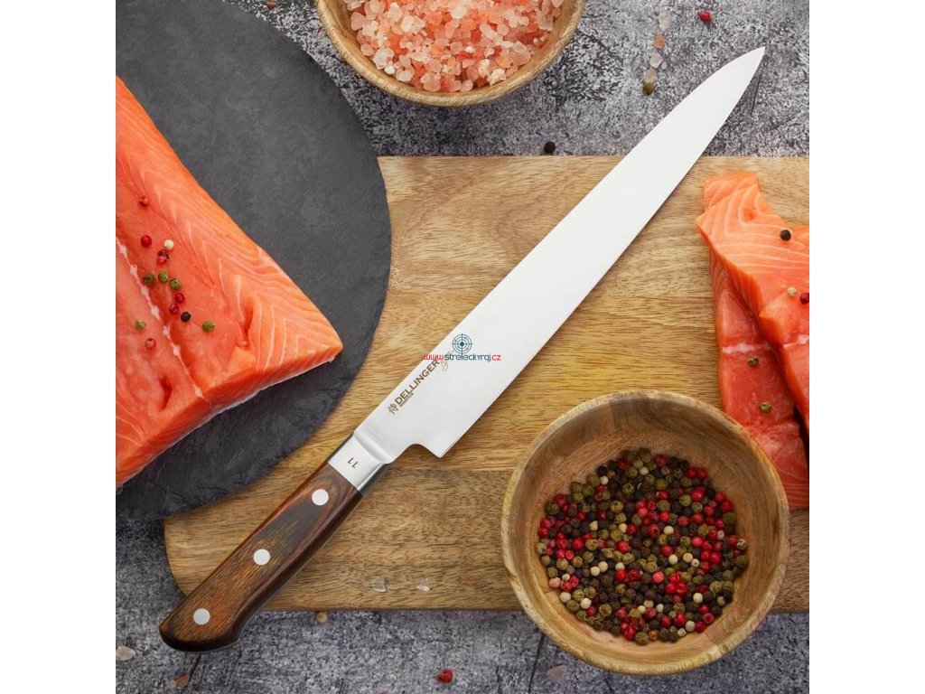 Jedenáctý nůž z nové série Dellinger Essence. Nejoblíbenější nůž šéfkuchaře Honzy Punčocháře z celé série Dellinger Essence. Honza sám říká, že je to nůž, který má duši – univerzální pomocník, se kterým se dá nakrájet úplně všechno. Stačí se nebát jeho velikosti! A my s jeho názorem souhlasíme. „Dlouhán“ je fakticky skvělý nůž, se kterým nakrájíte jemnou šalotku, tenoučké plátky parmské šunky nebo prostě pořádnej kus steaku. Je vyroben z prvotřídní německé oceli 1.4116, známé pro své skvělé řezné vlastnosti, dlouhou výdrž ostří a snadnou údržbu. „Dlouhán“ je prostě nůž, který si zamilujete a nebudete ho chtít dát z ruky.