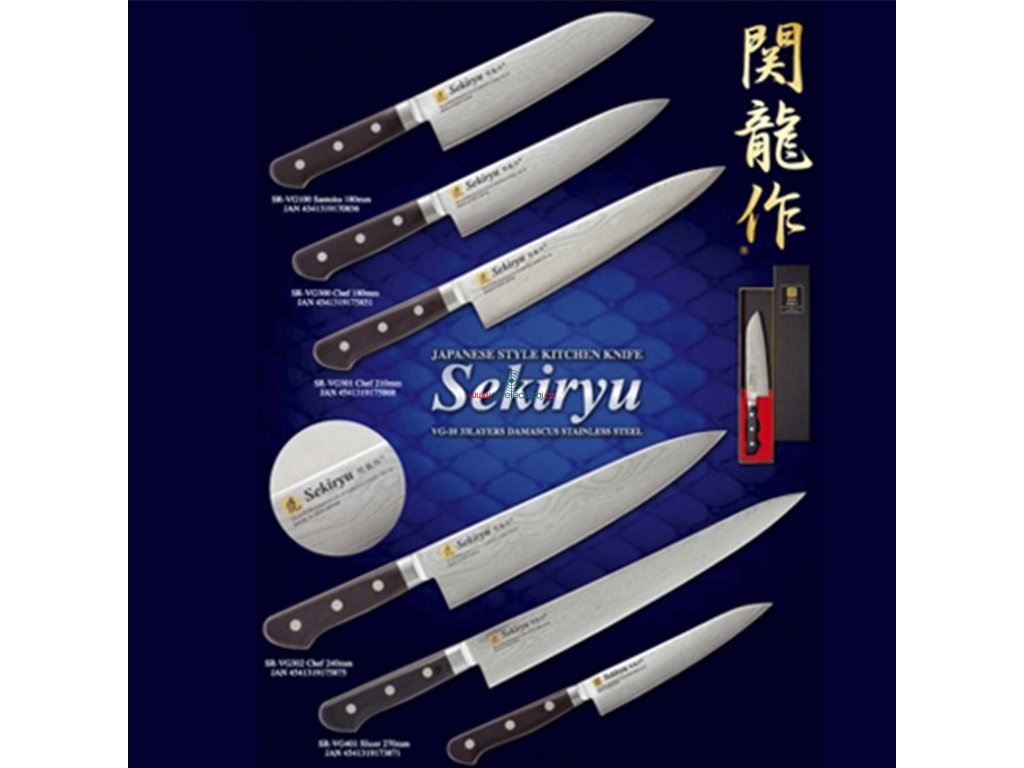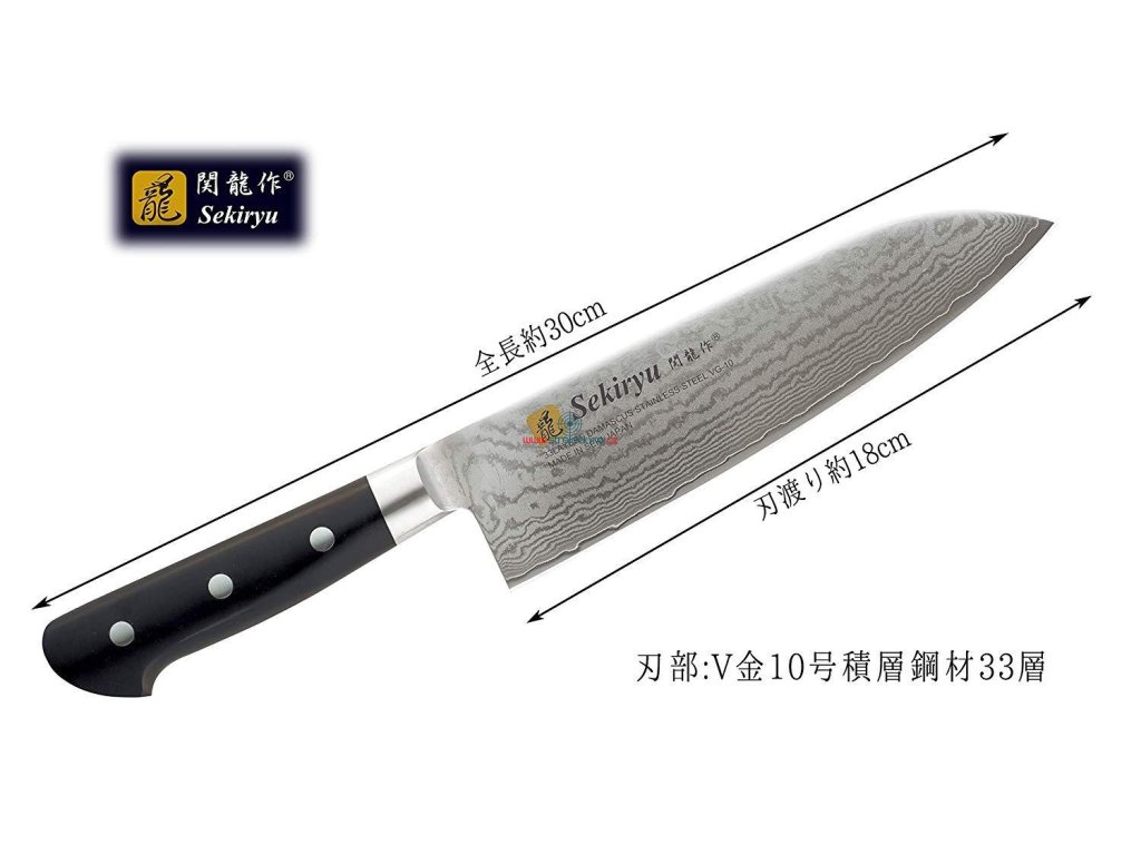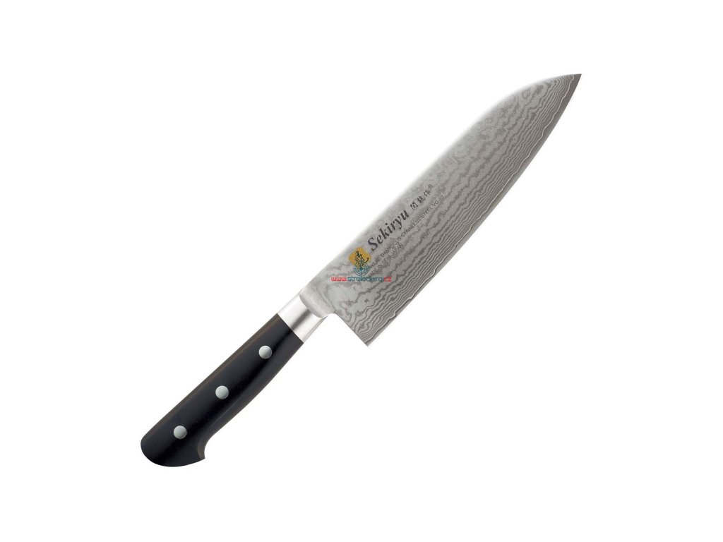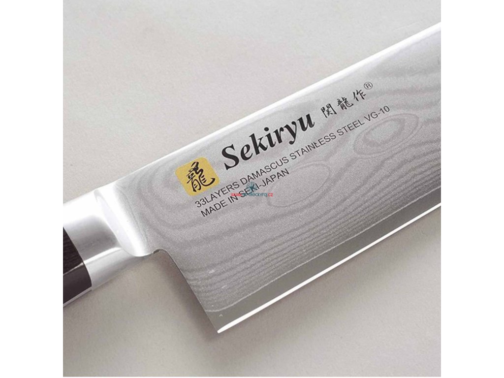 Nůž SANTOKU / Chef 180 mm Sekiryu od japonské společnosti má ultra ostré řezné jádro z japonské oceli vg10, které je velmi dobře chráněno proti korozi. Japonská ocel vg10 má dlouhotrvající ostrost při tvrdosti R62 +/- 1 Rockwella. Jádro z japonské oceli vg10 je vloženo mezi 66 vrstev 2 nerezových damascénských ocelí (damascus steel), které zajišťují mimořádnou odolnost a houževnatost. Dokonale vyvážená a široká čepel japonského tvaru s třpitivým damascénským vzorem minimalizuje tření při řezu a zabraňuje přilepení krájeného materiálu k čepeli. Damascénský vzor je jedinečný, neopakovatelný a stane se symbolem Vaší individuality.