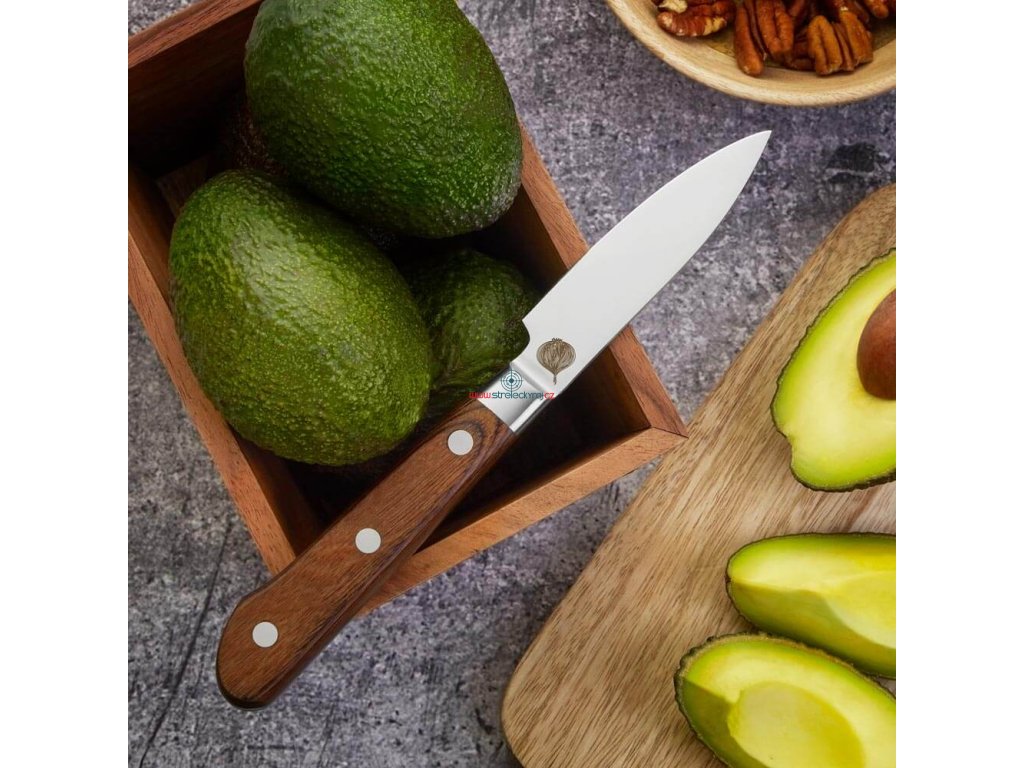 Druhý nůž z nové série Dellinger Essence. V Japonsku se okrajovací nůž nazývá "petty knife" (ペティナイフ, peti-naifu). Tento název pochází z anglického slova "petite" a označuje malý, všestranný nůž, který je ideální pro precizní práce, jako je loupání, okrajování nebo krájení menších surovin. Malý nůž „Páráček“ s čepelí dlouhou 80 mm je vyroben z německé oceli 1.4116, známé svou vysokou odolností proti korozi a schopností udržet ostří po dlouhou dobu. Okrajovací nůž s rukojetí z pakkawoodu, která je nejen stylová, ale i odolná vůči vlhkosti a teplotním změnám je velmi populární díky své univerzálnosti a pohodlnému použití.