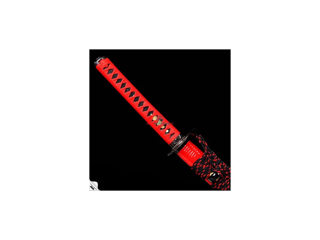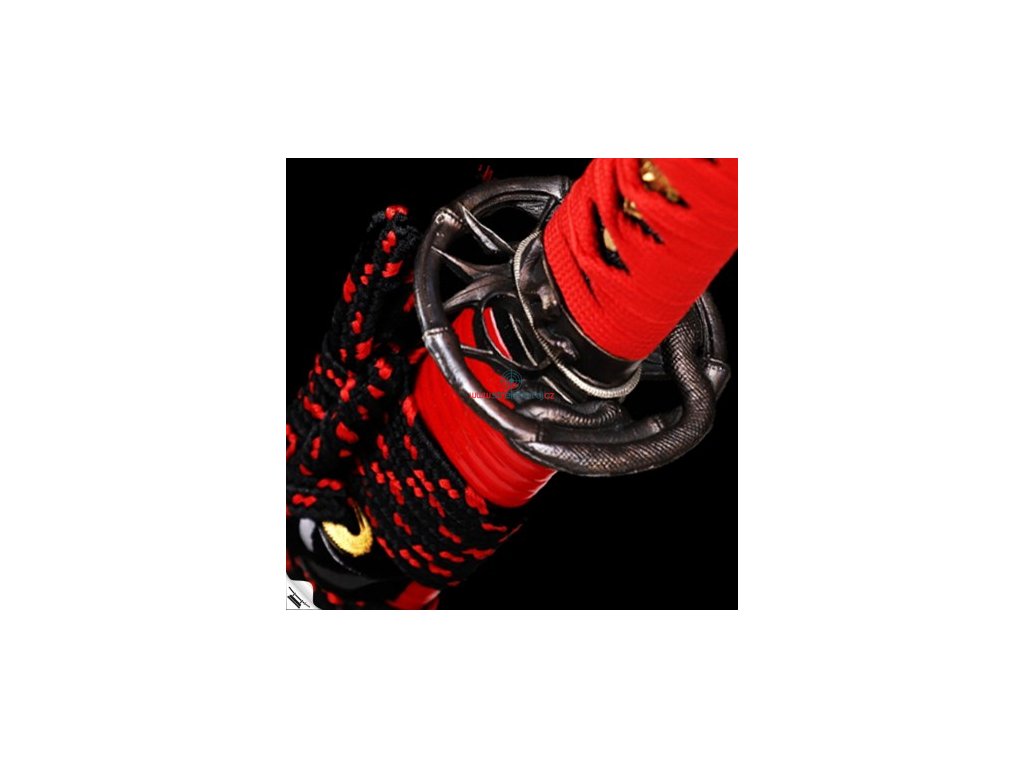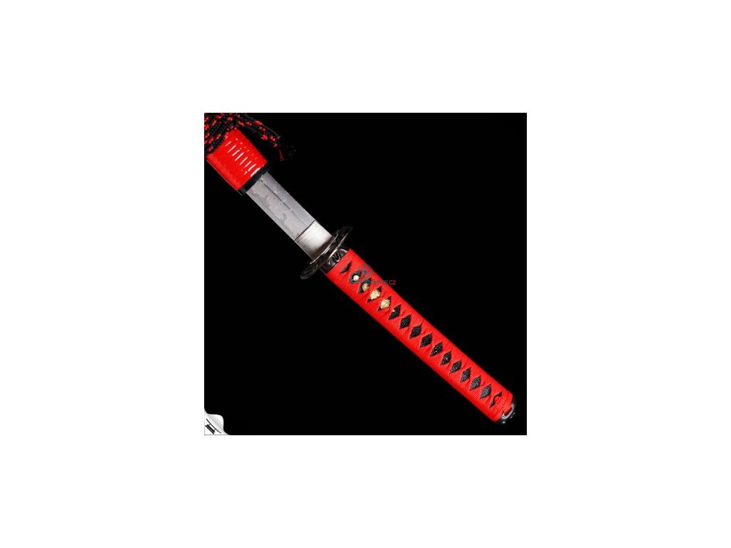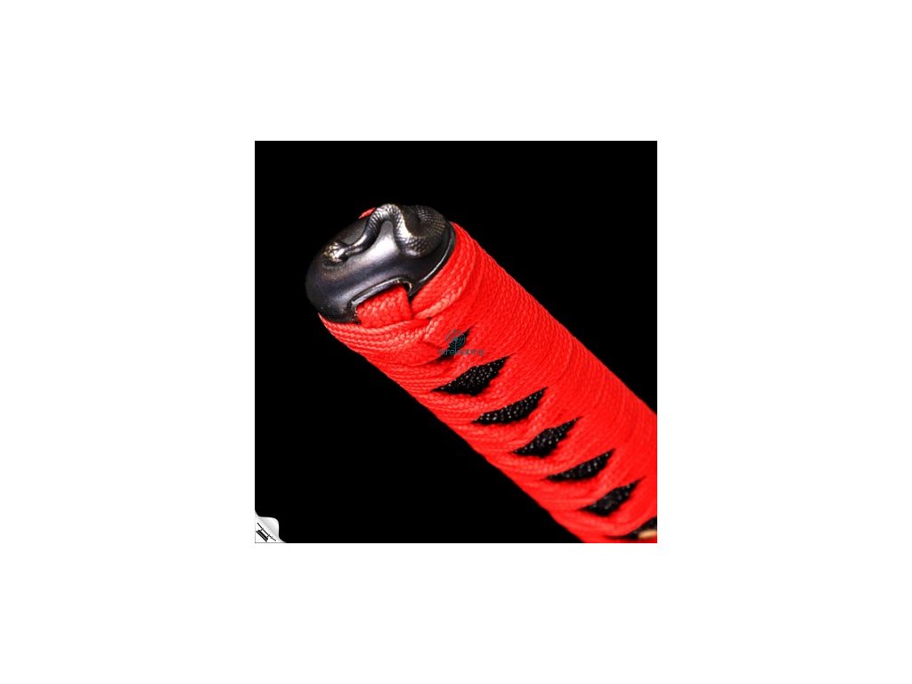 ✅ Tsuka - dřevěné jádro, potažena pravou rejnočí kůží (Samegawa), s červenou omotávkou. Čepel zajištěna 2 bambusovými kolíky "mekugi"