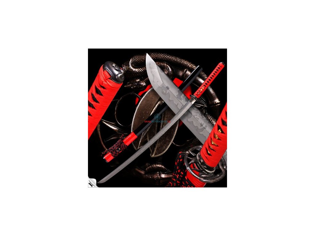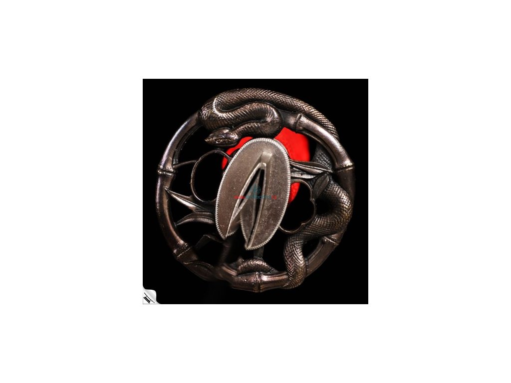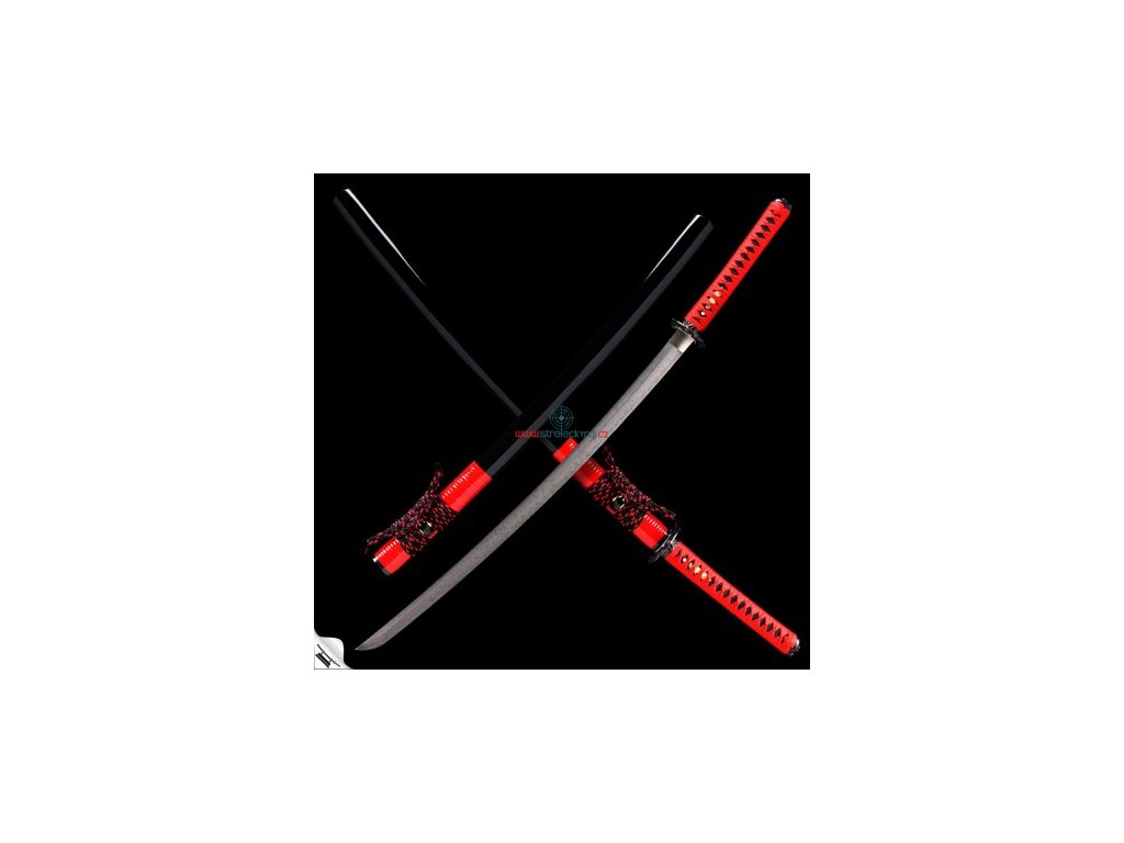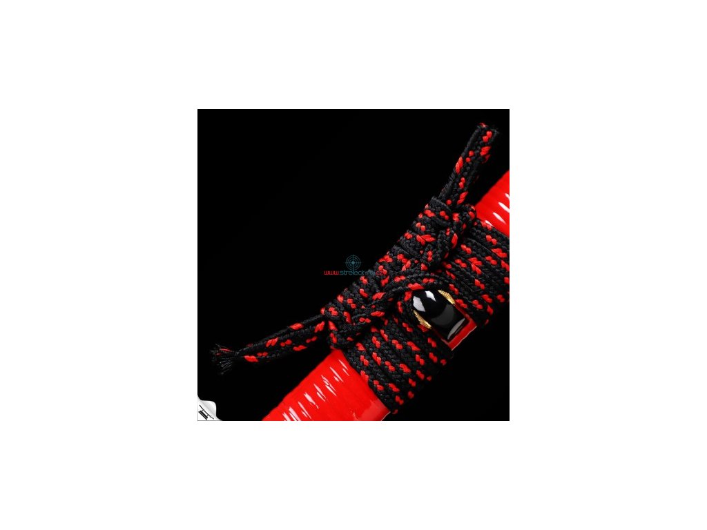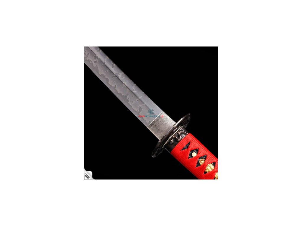 ✅ Tsuka - dřevěné jádro, potažena pravou rejnočí kůží (Samegawa), s červenou omotávkou. Čepel zajištěna 2 bambusovými kolíky "mekugi"