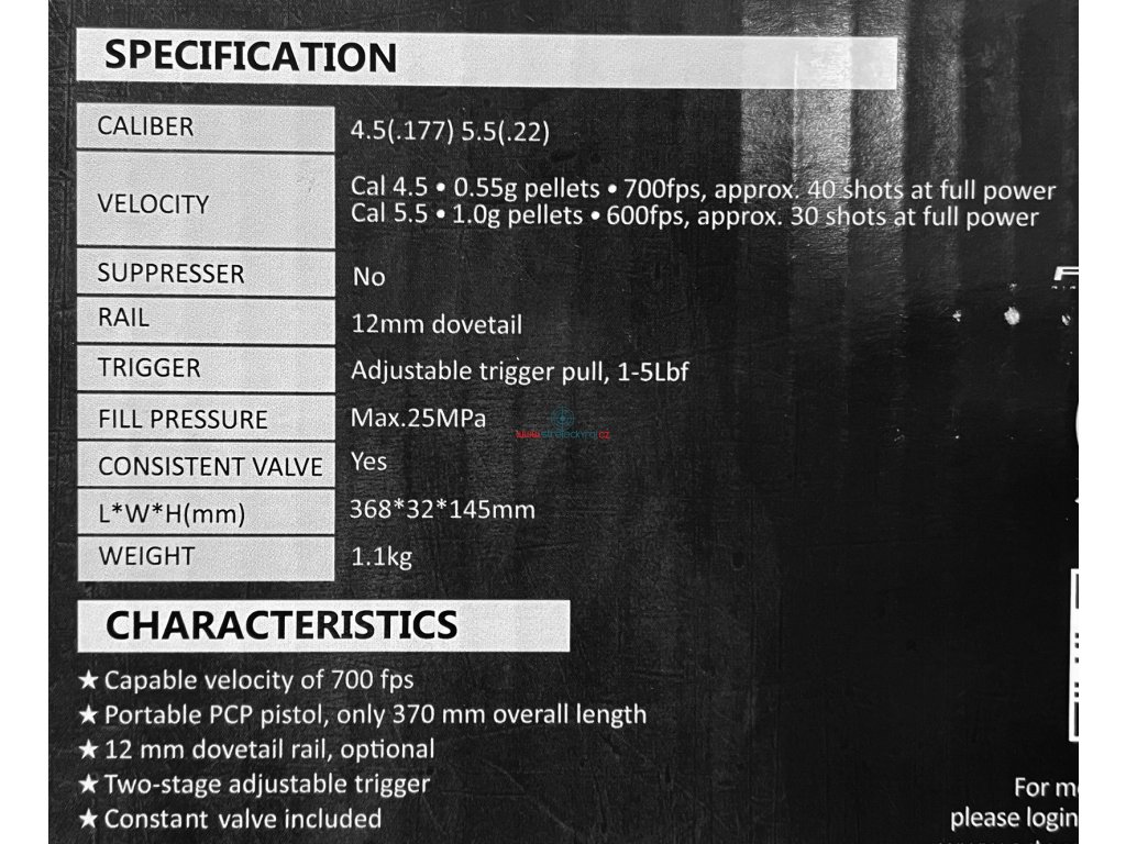 Pištoľ s kovovou konštrukciou tela i vnútorného mechanizmu má drážkovanú hlaveň s dĺžkou 272 mm pre presnú streľbu olovenými diabolkami kalibru 4,5 mm.