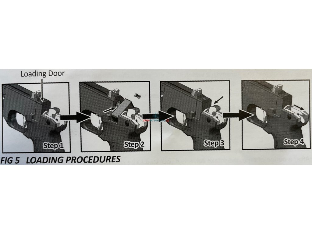 Zásobník stlačeného vzduchu, ktorému sa hovorí aj kartuša, má objem 70 kubických centimetrov, je umiestnený pod hlavnou a umožňuje okolo 30 výstrelov na jedno naplnenie.