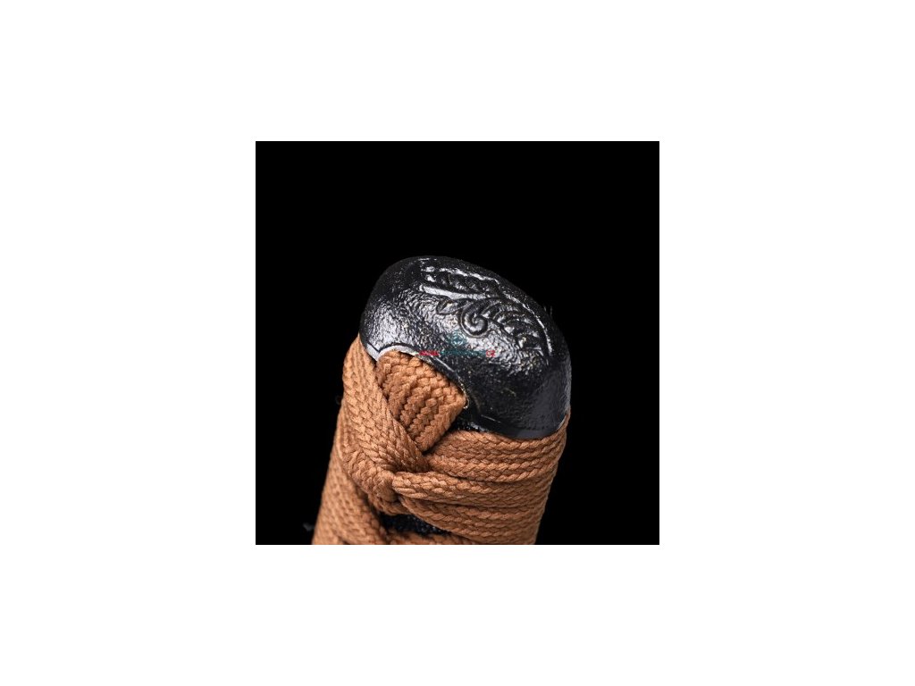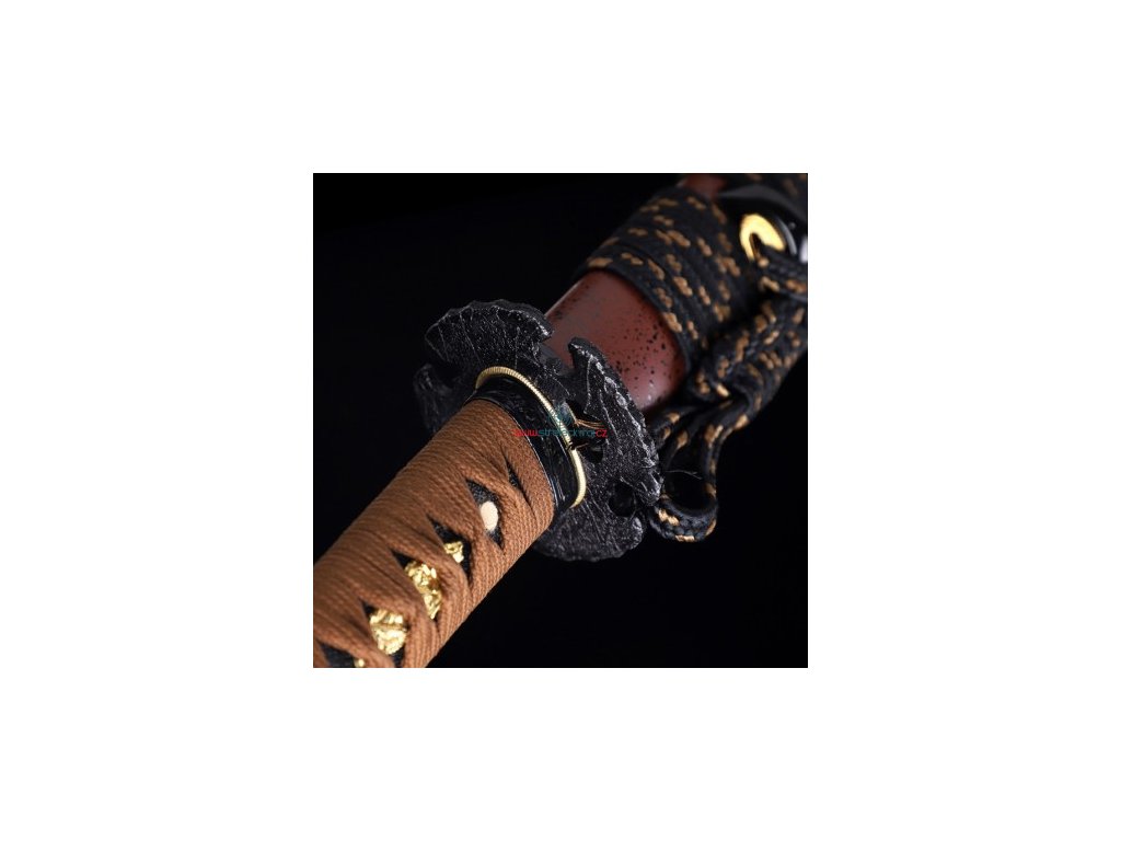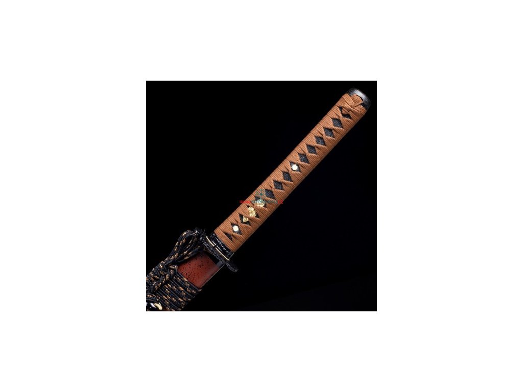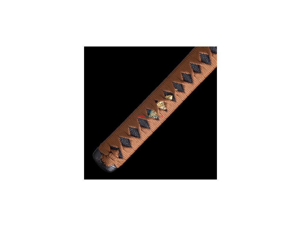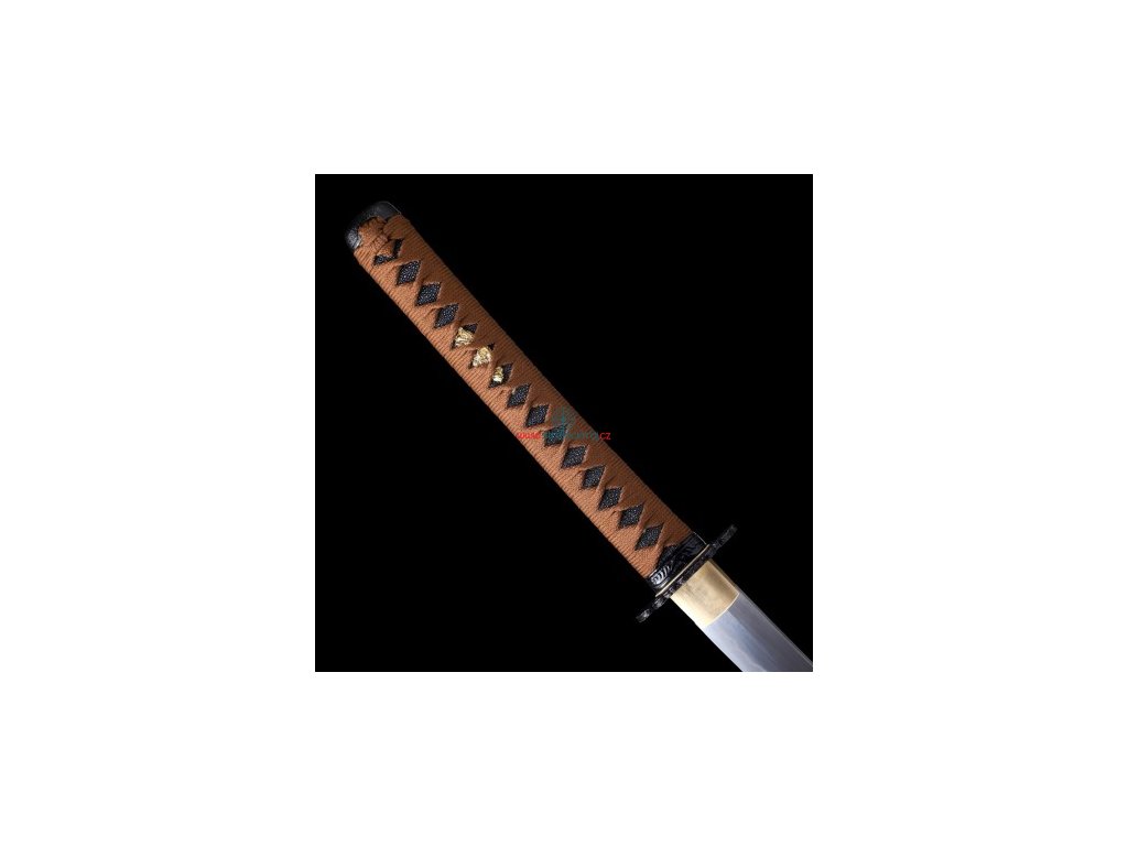 • Tsuka (rukojeť) - dřevěné jádro, potažena pravou rejnočí kůží (Samegawa), s kávovou hedvábnou omotávkou ITO. Čepel zajištěna 2 bambusovými kolíky "mekugi". Z každé strany najdete menuki (ornament).