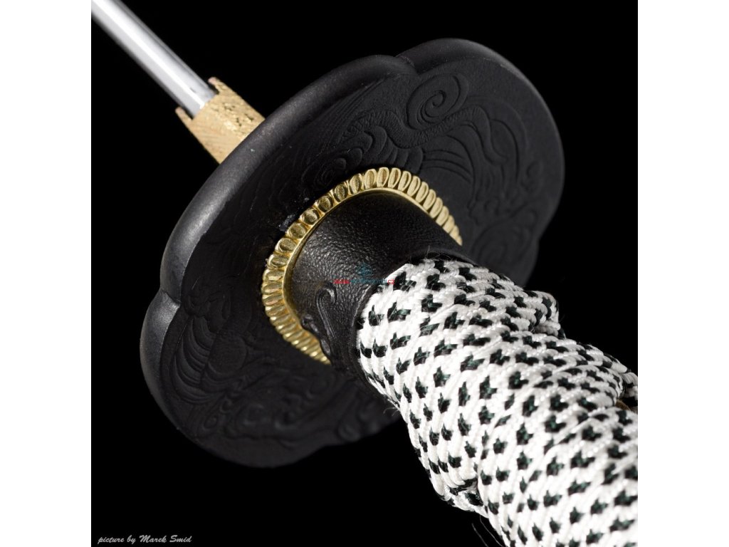 Kovaná čepel z oceli T-10 té nejvyšší kvality. Ocel byla laminována v monokompositní konfiguraci Maru - diferenciálně tvrzená. Uhlíková ocel T-10 (obsah 1,1% uhlíku a 0,4% manganu) je velmi pevná a skvěle drží ostrost. Čepel bez žlábku bo-hi byla ve finální fázi ručně leštěna kamenem hazuya - tím je dosaženo téměř žiletkového ostří (razor sharp) a zrcadlového lesku. Výrazný reálný Choji hamon je tvořen dle dávných tradičních metod, které vychází z mnohaletých zkušeností kovářského mistra, který výrobou této nádherné zbraně strávil několik dnů. Vše na tomto meči je individuálně zhotoveno, včetně sayi a habaki, jsou použity nejkvalitnější komponenty, včetně špičkového laku na saye, japonského hedvábí a skutečné rejnočí kůže nejvyšší kvality. Jedná se o špičkovou repliku samurajského meče, která je vhodná k sekovým zkouškám a lze ji rozložit na jednotlivé části. Tato čepel byla vyzkoušena a testována tak, aby odstranila vše co jí stojí v cestě ! Sori (zakřivení čepele) je speciálně navrženo tak, aby bylo dosaženo co možná nejjemnějších a nejčistších řezů. To vše v kombinaci s výběrem tradičního kovaného Koshirae zaručuje, že získáte to nejlepší z hlediska vzhledu i funkčnosti. Uhlíková ocel T-10 má působivou tvrdost HRC 58 - perfektní kombinace této tvrdosti je podtrženo zakřivením čepele Sori, které umožňuje snadné přeseknutí tatami, slaměné rohože, nebo bambusu pro tameshigiri. Full tang konstrukce této katany výrazně zvyšuje sílu meče. Čepel je typu shinogi-zukuri, tento typ čepele se vyrábí od 10.století našeho letopočtu. Hrot meče o kissaki se skutečným Diamond-Shaped Yokote, které je velmi dobře definováno tím, že hamon prochází po celé délce přes Boshi. Yokote je velmi důležité pro strukturální integritu špičky meče. Pomáhá absorbovat otřes, rozptýlí sílu a přispívá k stabilitě a síle meče při tzv. sekořezu. Tato katana (samurajský meč) je vhodná na použití v praxi, firmaDellinger se však zříká jakékoliv odpovědnosti za zranění a poškození vzniklá při použití. Schraňujte mimo dosah dětí ! Jakákoliv manipulace se samurajským mečem je na vaší vlastní odpovědnost. Nezapomeňte, že máte ve svých rukou smrtící zbraň !